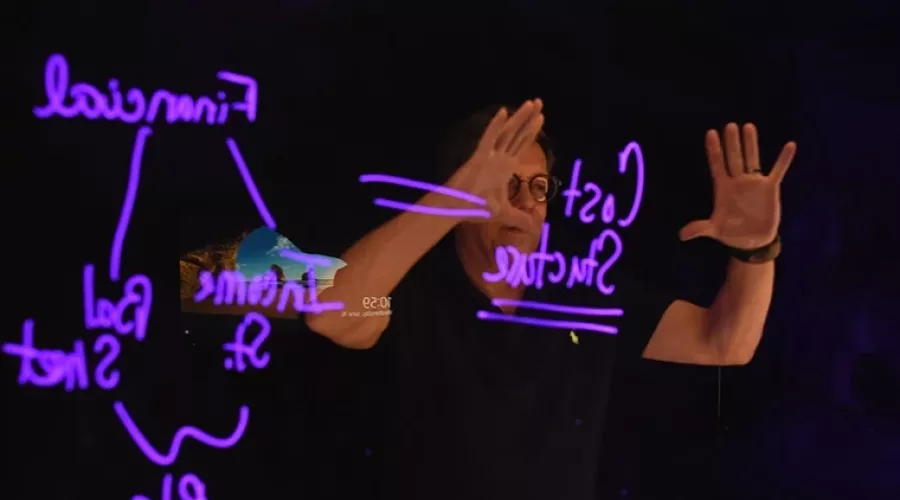 John’s current title is Director of IT Services at the College, but his work is far from limited to IT. In many ways, his support role extends to everything from running A/V for events in the PNC Horn Auditorium to shooting MBA student professional headshots to operating the latest technology for the College faculty, the integrated media’s lightboard. An illuminated glass chalkboard, the lightboard allows professors to face their students while recording video lectures for online classes.