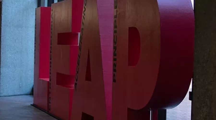 “We will be the example of building a business school that serves its constituents,” announced Dean Todd Mooradian in his impassioned remarks officially the unveiling four, nine-foot letters which make up LEAP, a sculpture representing the College of Business’ identity. LEAP is an acronym (Louisville Entrepreneurial Accelerating Principled) for the College’s unique qualities which define the school’s intent and guide activities. Dean Mooradian directly addressed the faculty and staff gathered for the ceremony and hopes the sculpture will serve as a daily reminder. “I hope you walk by LEAP and say ‘I know why I am here. I know what I am contributing to. I know what to use as my North Star when I’m looking for direction and making decisions and making investments.’”