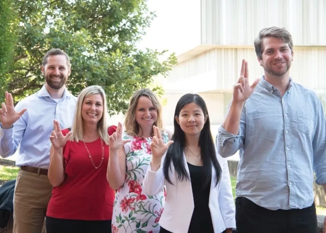 College of Business and Cardinal Marching Band students pose for a group photo during the 2023 Homecoming game.